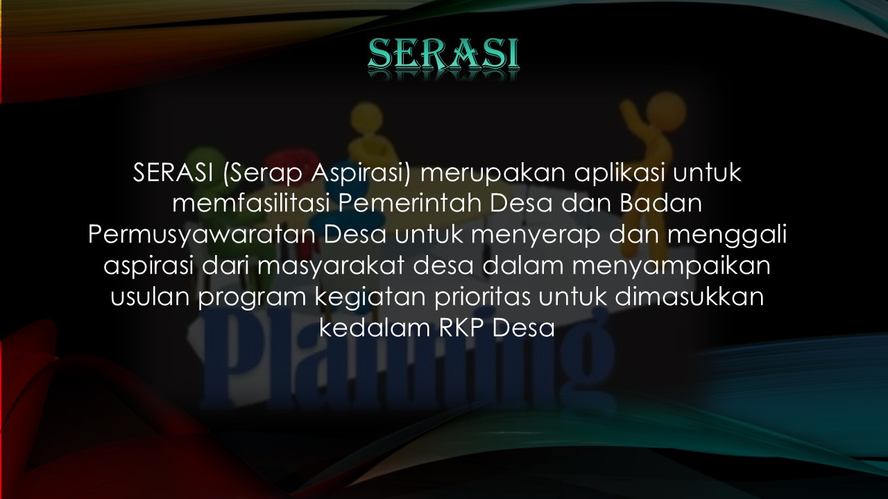 - SERASI “SERASI (Serap Aspirasi) merupakan aplikasi untuk memfasilitasi Pemerintah Desa dan Badan Permusyawaratan Desa untuk menyerap dan menggali aspirasi dari masyarakat desa dalam menyampaikan usulan program kegiatan prioritas untuk dimasukkan kedalam RKP Desa (Rencana Kerja Pemerintah Desa)
